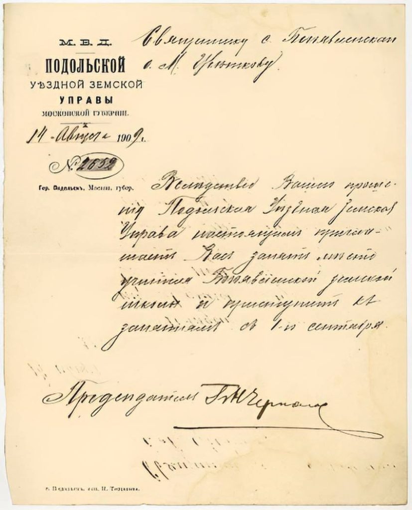 «Вследствие Вашей просьбы Подольская уездная земская Управа настоящим приглашает Вас занять место учителя Богоявленской земской школы и приступить к занятиям с 1-го сентября».